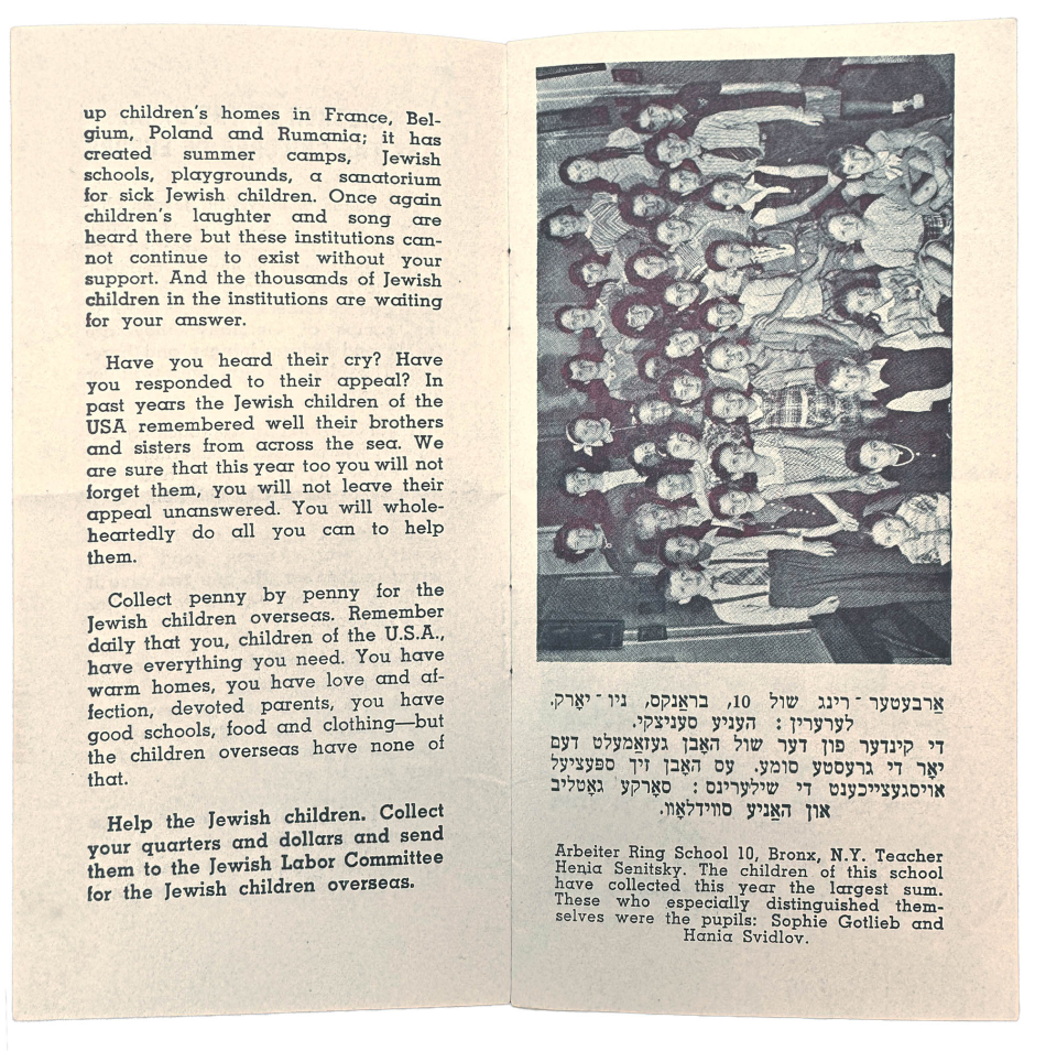 This in an appeal booklet that comes from YIVO’s Jewish Labor Committee (JLC) collection. It seeks support for Jewish children who had survived the Holocaust and were living in one of the children’s homes built and run by the Jewish Labor Committee. With texts in Yiddish and English, the booklet was distributed to Jewish children attending one of the Arbeter Ring schools in the United States. In an effort to help the children in the US connect with those in Europe, it features photographs of daily activities in JLC-supported homes in France and Belgium. The booklet reminds the children in the US that they are fortunate to have everything they need: “You have warm homes, you have love and affection, devoted parents, you have good schools, food and clothing.” In contrast, the booklet states bluntly, “But the children overseas have none of that,” and implores those in the US to “collect penny by penny” to help the JLC supply Europe’s surviving Jewish youth with winter coats, shoes, warm underwear, toys, and textbooks.