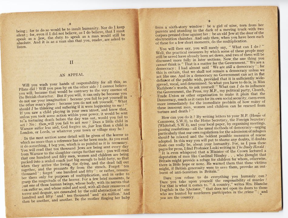 This pamphlet, a best-seller for his publishing house, was a call to action. It described Nazi atrocities and the mass murder of Jews, and readers were urged to write to their representatives in Parliament to demand that immigration regulations should be relaxed for Jewish refugees and that “the boldest possible measures of rescue adopted.”